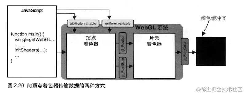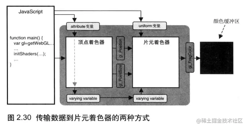 目前,将js程序中的数据传给顶点着色器,有两种方式:attribute 变量 和 uniform 变量。