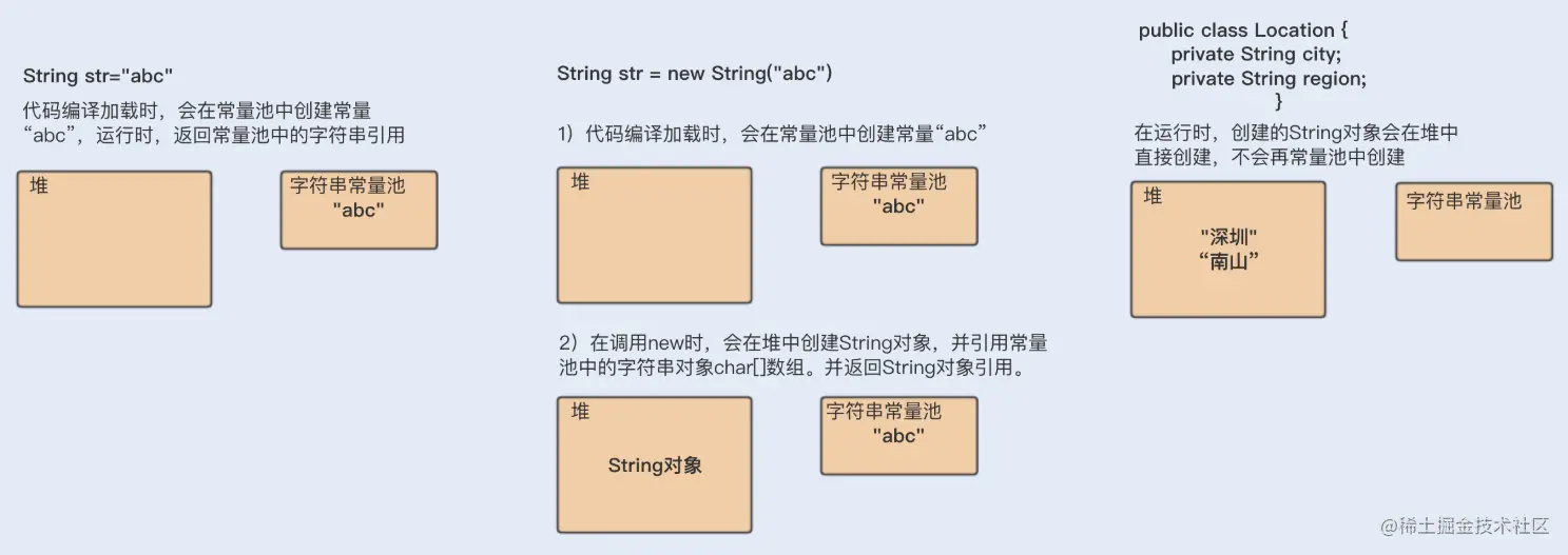 String str = new String(“abc”) 这种方式,首先在编译类文件时,"abc"常量字符串将会放入到常量结构中,在类加载时,“abc"将会在常量池中创建;其次,在调用 new 时,JVM 命令将会调用 String 的构造函数,同时引用常量池中的"abc” 字符串,在堆内存中创建一个 String 对象;最后,str 将引用 String 对象。