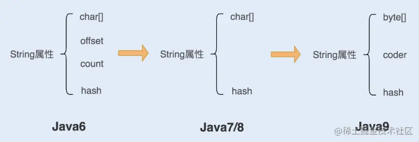 从 Java7 版本开始到 Java8 版本,Java 对 String 类做了一些改变。String 类中不再有 offset 和 count 两个变量了。这样的好处是 String 对象占用的内存稍微少了些,同时,String.substring 方法也不再共享 char[],从而解决了使用该方法可能导致的内存泄漏问题。