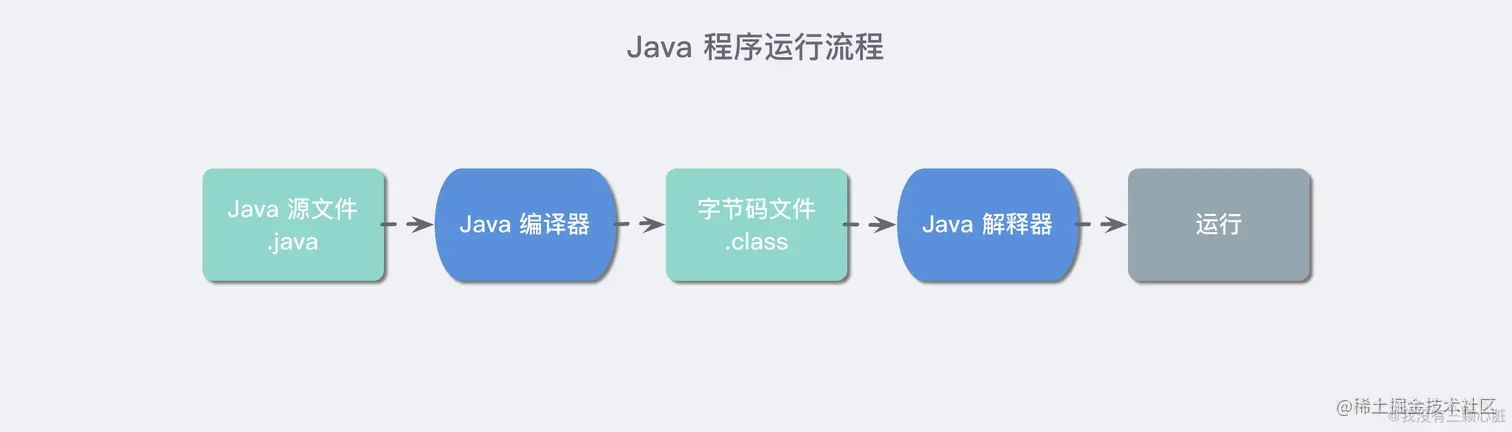 首先,我们知道,Java 为了实现 「一次编译,到处运行」 的目标,采用了一种特别的方案:先 编译 为 与任何具体及其环境及操作系统环境无关的中间代码(也就是 .class 字节码文件),然后交由各个平台特定的 Java 解释器(也就是 JVM)来负责 解释 运行。