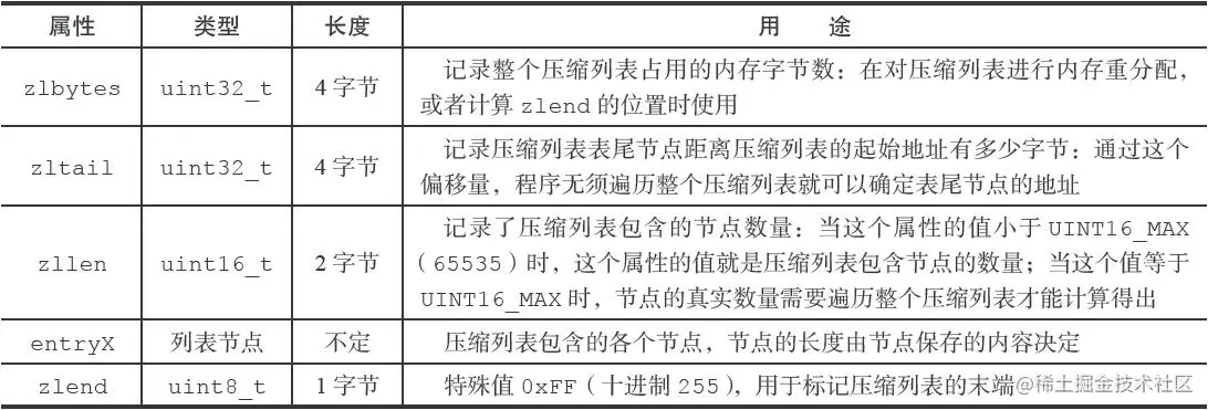 压缩列表由zlbytes,zltail,zllen,entryX,alend组成;