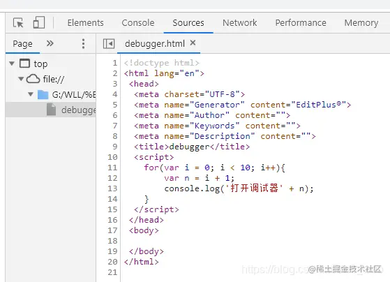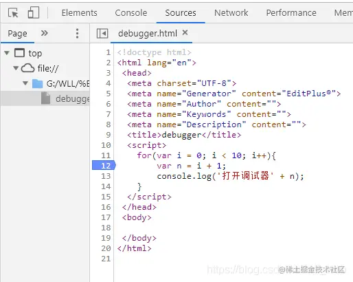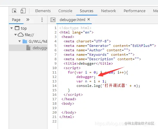 debugger:停止JS的执行,相当于设置断点。 在JS代码编写的过程中,我们都会通过浏览器的调试模式(F12)来检查代码是否正确,大多数我们都是通过设置断点来进行调试。 打开浏览器按F12: