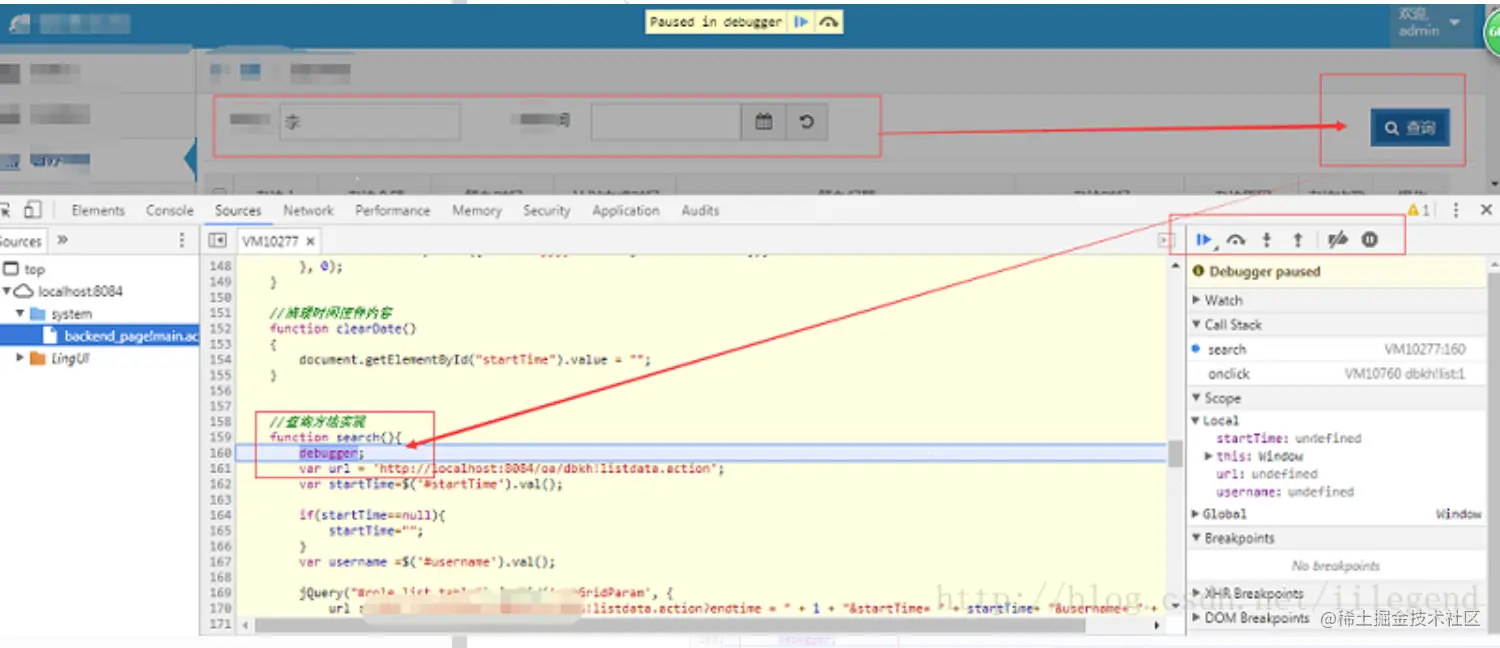 在谷歌浏览器中运行项目,打开F12,然后输入条件,并且点击“查询”按钮,回到如下图: