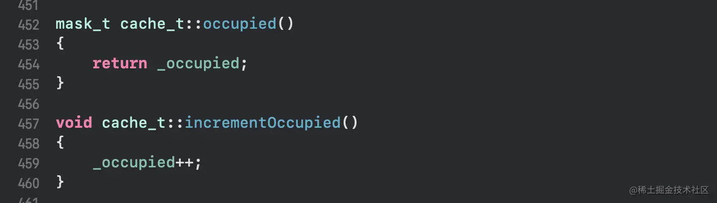 我们大致可以猜测到,这个_****occupied字段应该是目前缓存的方法的个数。然后我们全局搜索incrementOccupied();在OC源码中找到如下内容:
