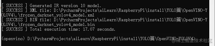 切换到 OpenVINO-YOLOV4 目录下,将 pb 文件 转化为 xml 和 bin 文件。