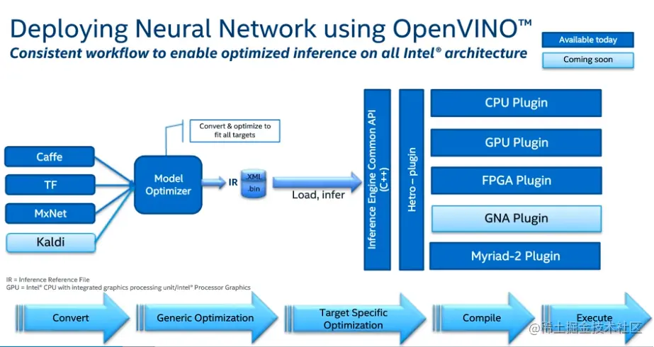 另一种主流框架 Pytorch 若要用 openvino 做优化的话,那其转换流程为,先将 pytorch 的模型文件 .pt,转化为 onnx 格式,然后再转化成 IR 模型,即可部署到神经棒上了。