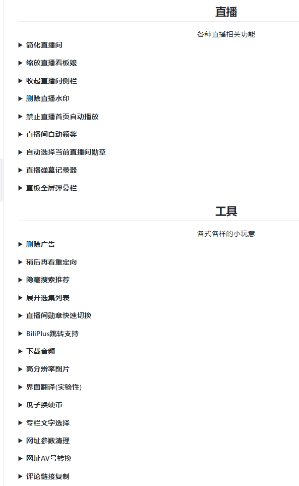 以及针对直播功能的完善,简化直播间、去水印、自动领奖、弹幕记录等各种直播相关功能,和删除广告、下载音频、瓜子换硬币、网址AV号转换等小工具