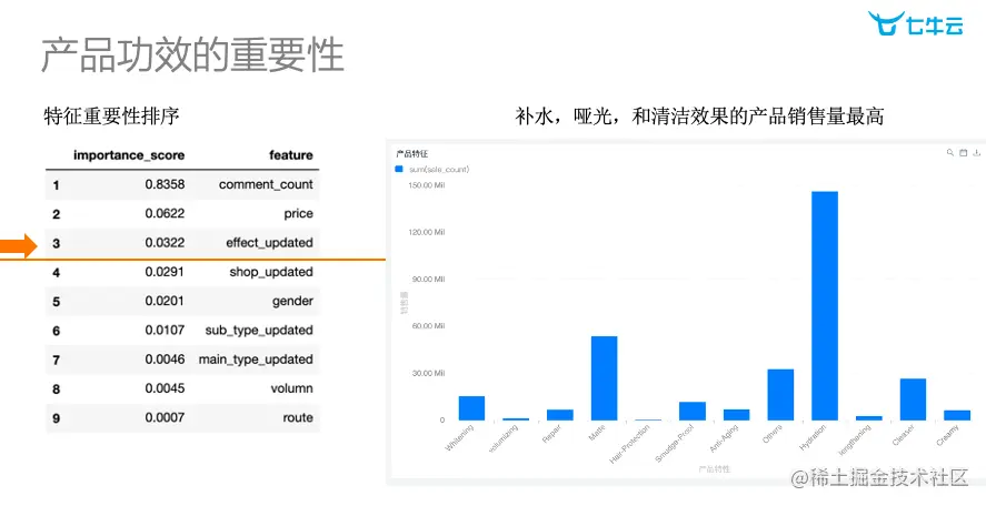 “变量重要性”是我们在分析中所需要关注到的一个重点。针对电商,通常评论数量、价格和产品功效是影响销量的三大关键因素。评论数量越多,销量就越高;价格正好相反,价格越低,销量就越高;针对化妆品这一品类,补水这一功能产品明显比其他的卖得好。