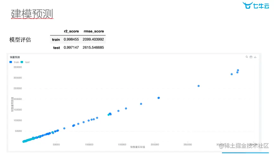 从散点图展示,销量的预测值和实际值很接近,几乎完美地服从 y=x 的直线分布,所以能够判断出,这个模型能够帮助我们有效进行分析。