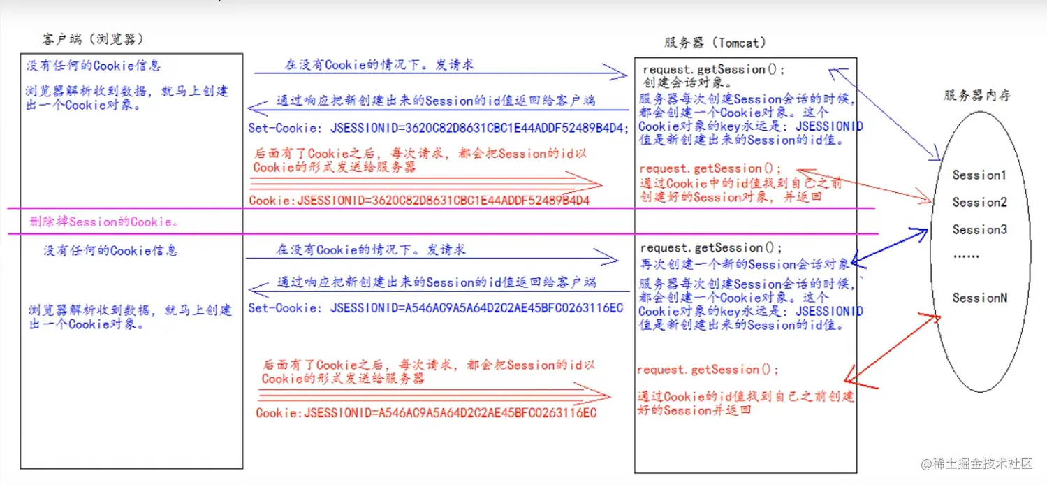 cookie中有一对名称值,存储的是是 JSESSION和Sessionid,用来标识session。也就是说session是基于cookie实现的。