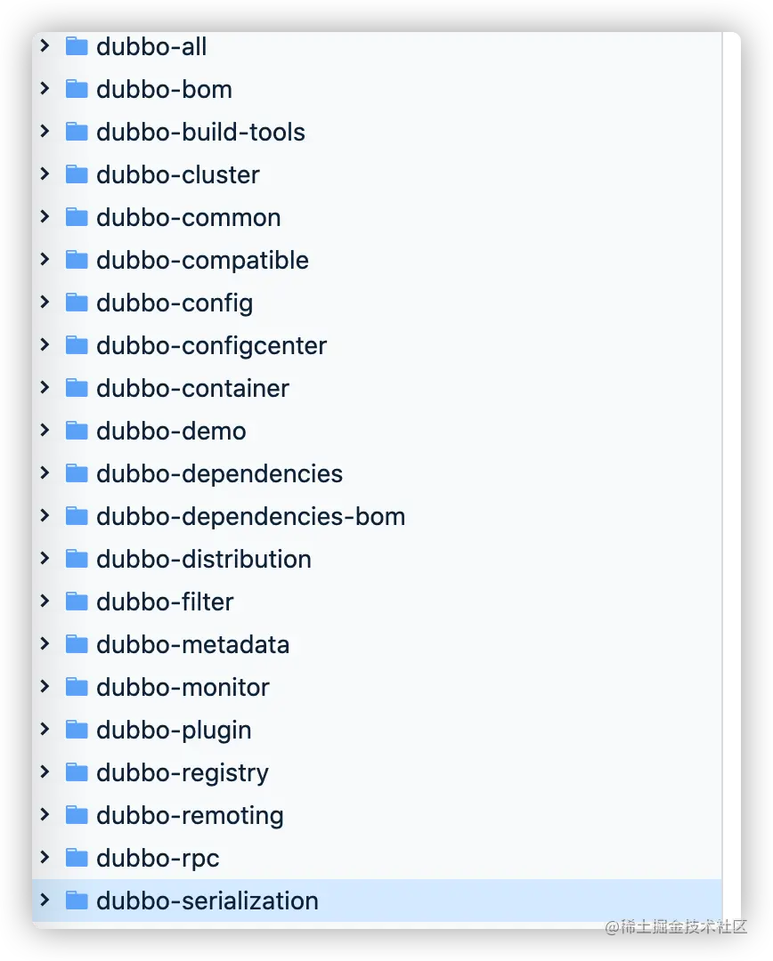 建议项目文件夹名称使用串式命名法(kebab-case),比如 dubbo 项目的各个模块的命名是下面这样的。