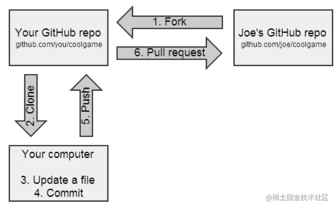 1、Fork他的仓库:这是GitHub操作,这个操作会复制Joe的仓库(包括文件,提交历史,issues,和其余一些东西)。复制后的仓库在你自己的GitHub帐号下。目前,你本地计算机对这个仓库没有任何操作。