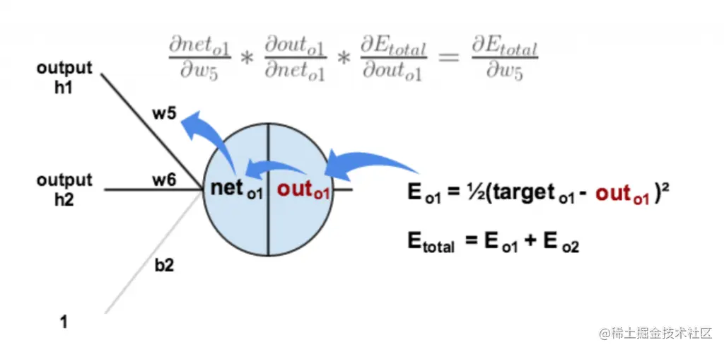 以权重参数 w5 为例,如果我们想知道 w5 对整体误差产生了多少影响,可以用整体误差对 w5 求偏导求出。