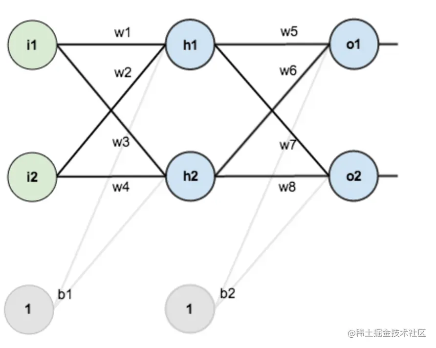 第一层是输入层,包含两个神经元 i1, i2 和截距项 b1(偏置);