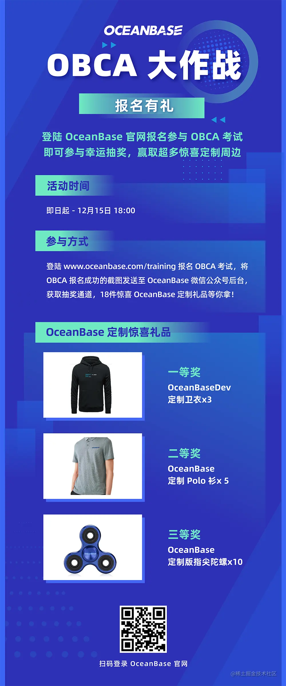 同时,为了答谢更多对 OBCA 感兴趣的小伙伴们,只要在 12.15日 前完成线上考试报名,即可参与幸运抽奖,快来赢取超多惊喜 OceanBase 定制周边吧!