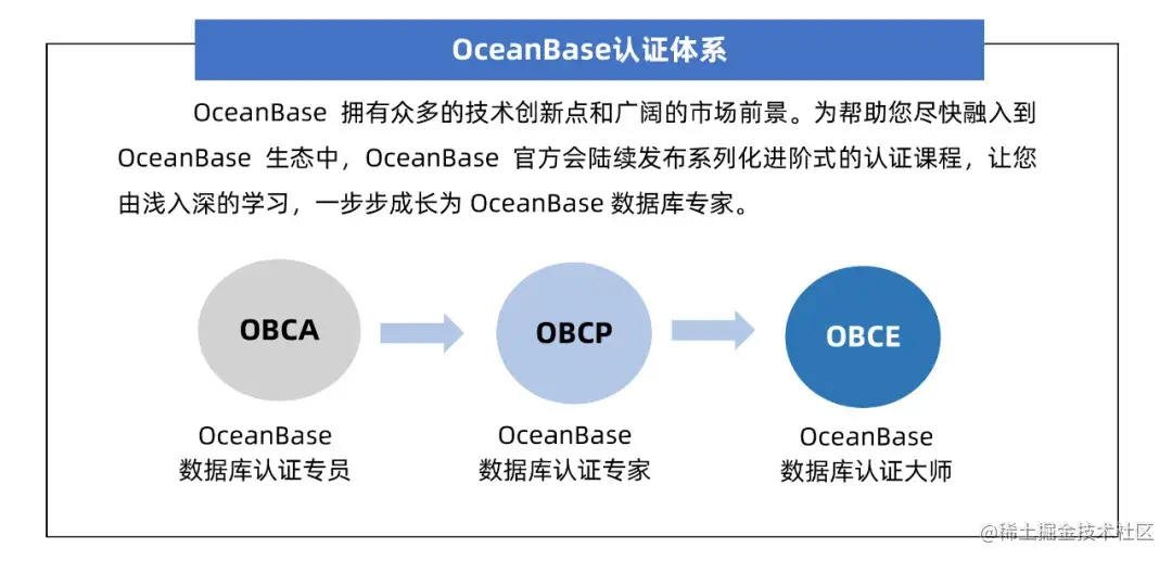 近期,OceanBase 已经开放了OBCP(OceanBase 数据库认证专家)的学习材料,12月底即将开放报名。后续,我们还将上线 OBCE(OceanBase 数据库认证大师)认证,希望通过完整系统化的知识体系,帮助更多数据库行业人才一步步成长为 OceanBase 数据库专家,高效融入 OceanBase 技术生态体系。