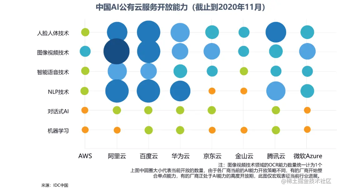 国际数据公司(IDC)最新发布的《中国AI云服务市场(2020上半年)跟踪》报告显示, 2020年上半年中国AI云服务市场规模达10.9亿元人民币,相比2019年上半年实现了超过100%的增长 。云服务厂商能够提供丰富且快速迭代的单点AI能力,也具备为行业用户打造应用场景方案以及行业整体解决方案的能力。AI公有云服务市场仍然处于早期阶段,未来,AI云服务厂商将在整体AI软件及应用市场中获得越来越高的市场份额。
