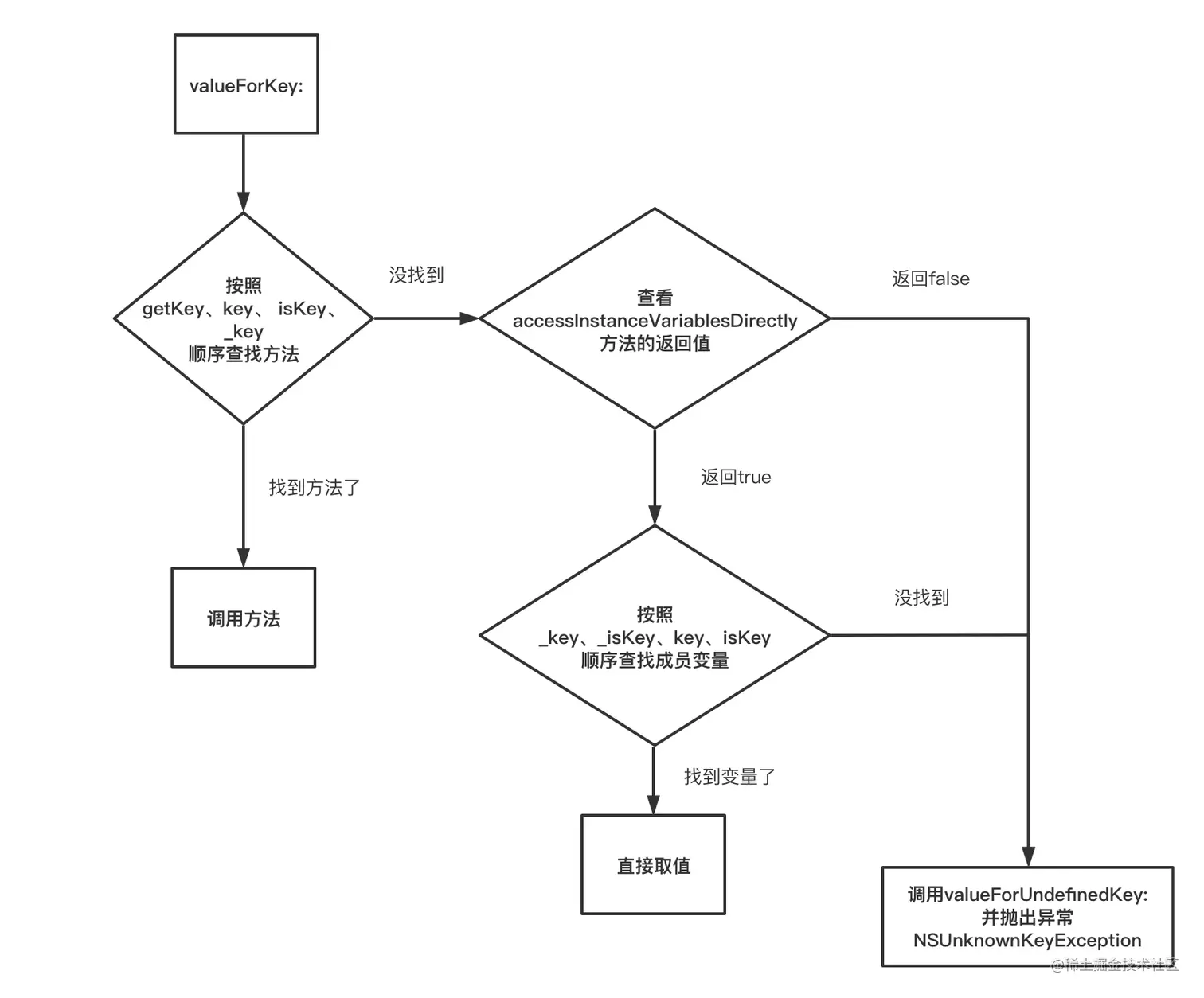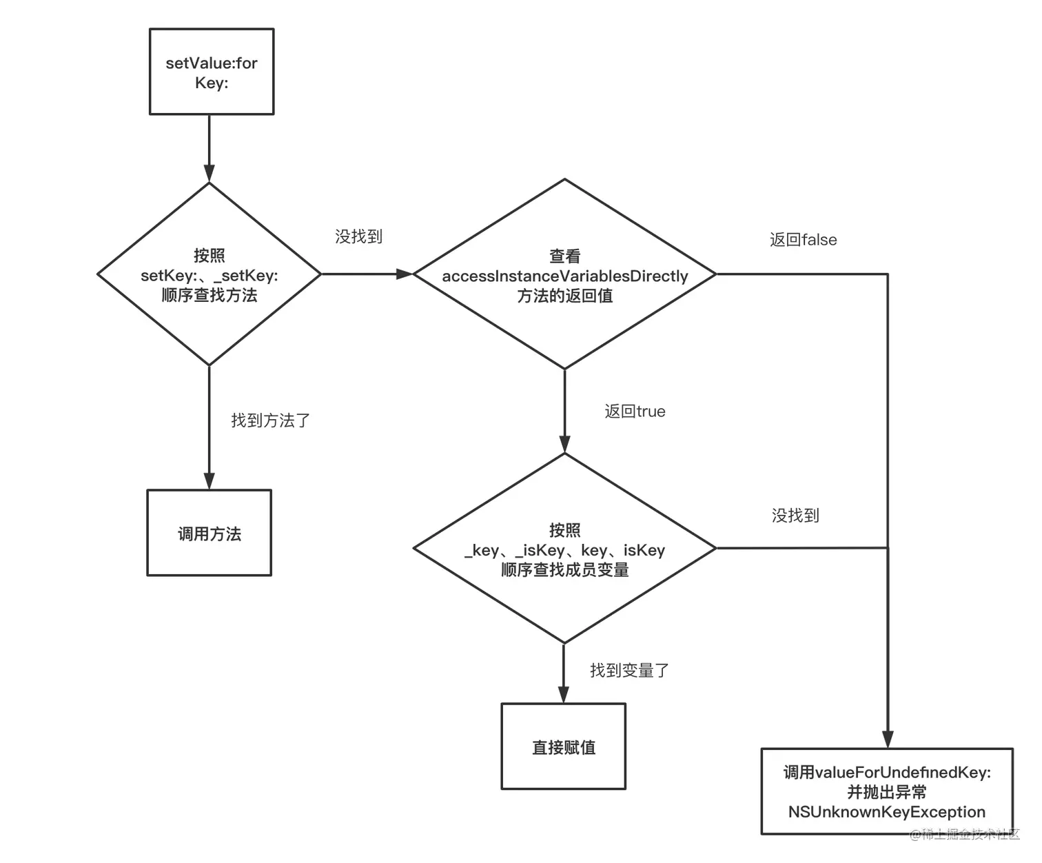 如果对象没有属性但是有成员变量,那么默认情况也就没有 setKey 方法了,所以根据上面的流程图也就知道如果此时对成员变量进行 KVC 操作,走的是直接赋值操作。