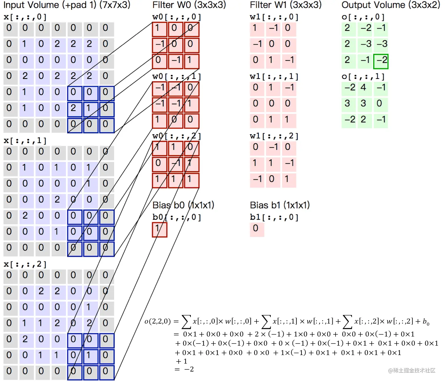 上图给出一个卷积计算过程的示例图,输入图像大小为 H=5,W=5,D=3,即 5×5 大小的 3 通道(RGB,也称作深度)彩色图像。这个示例图中包含两(用 K 表示)组卷积核,即图中滤波器 W0 和 W1。在卷积计算中,通常对不同的输入通道采用不同的卷积核,如图示例中每组卷积核包含(D=3)个 3×3(用 F×F 表示)大小的卷积核。另外,这个示例中卷积核在图像的水平方向(W 方向)和垂直方向(H 方向)的滑动步长为 2(用 S 表示);对输入图像周围各填充 1(用 P 表示)个 0,即图中输入层原始数据为蓝色部分,灰色部分是进行了大小为 1 的扩展,用 0 来进行扩展。经过卷积操作得到输出为 3×3×2(用 Ho×Wo×K 表示)大小的特征图,即 3×3 大小的 2 通道特征图,其中 Ho 计算公式为:Ho=(H−F+2×P)/S+1,Wo 同理。 而输出特征图中的每个像素,是每组滤波器与输入图像每个特征图的内积再求和,再加上偏置 bo,偏置通常对于每个输出特征图是共享的。输出特征图 o[:,:,0] 中的最后一个−2 计算如上图右下角公式所示。