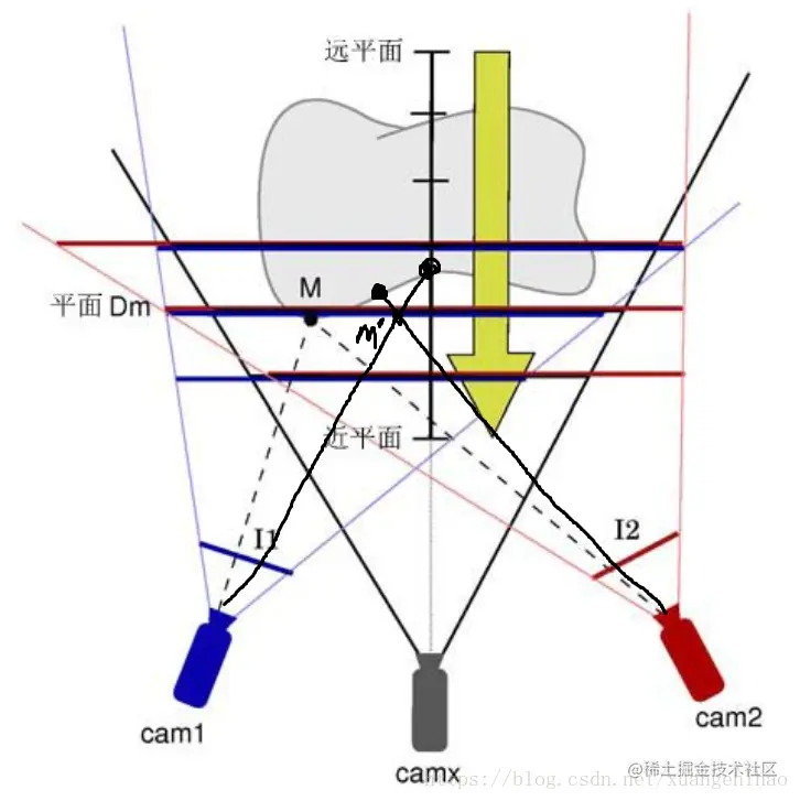 - 假设(定义):所有物体只有漫反射,有一个虚拟相机cam x,定义一个近平面和一个远平面,在这之间物体被一系列密集的平行平面划分