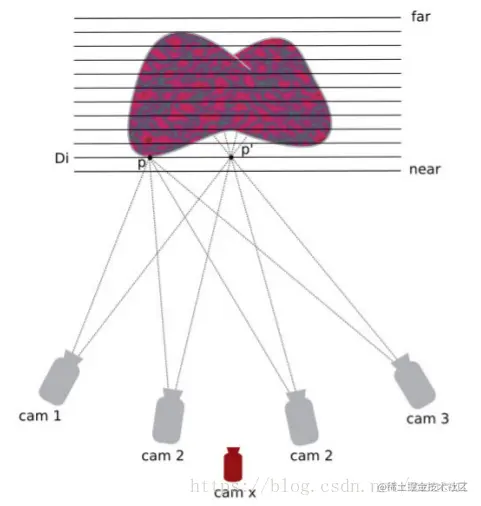 对于平行平面Di上的每个点p,将其投影到所有相机上,之后根据投影的颜色进行匹配计算,得到点p对应的分数以及其对应的深度,p得分越高,代表其投影在各相机上的颜色越接近 p计算之后,将其投影到虚拟相机cam x上,从后向前扫描,如果某一个平面Dj上的点q投影到cam x后,发现得分高于之前该点的分数,则更新该点的分数和深度,直至平面扫描结束