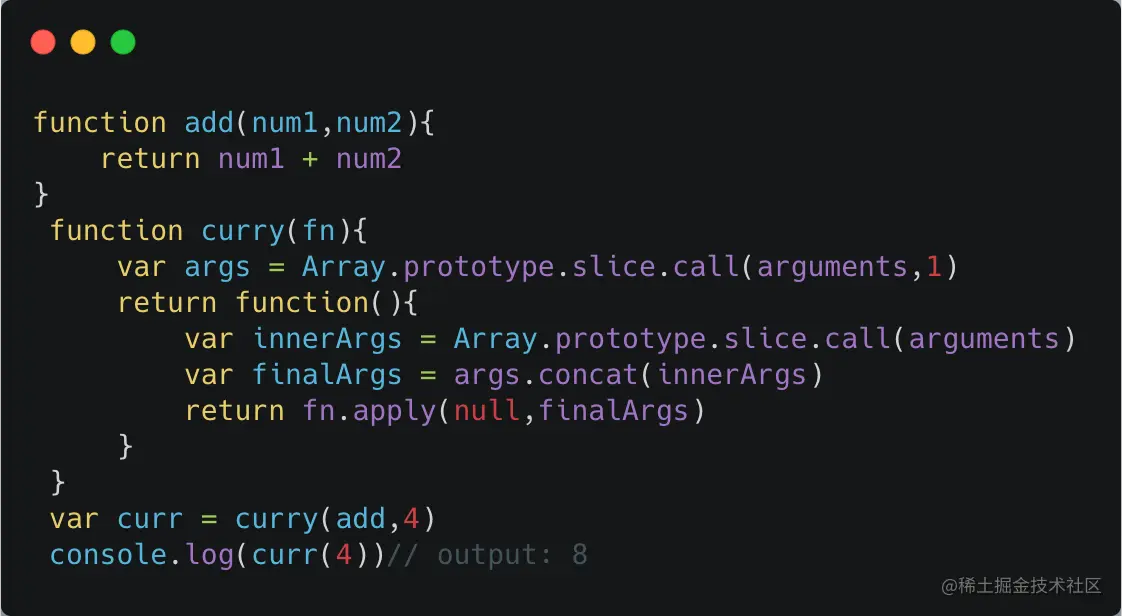 这个例子看起来有点复杂,其实就是相当于在第一次调用curry函数的时候传了一个累加器以及一个保存在args里面的**初始值****,**然后在第二次调用的时候将新参数与旧参数融合再调用累加函数,4+4结果当然是8。OK了解到它的基本原理 每次传一个参数,分多次调用,那我们就来实现一个简单的列子吧