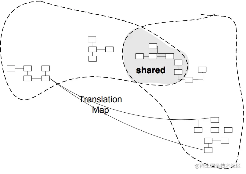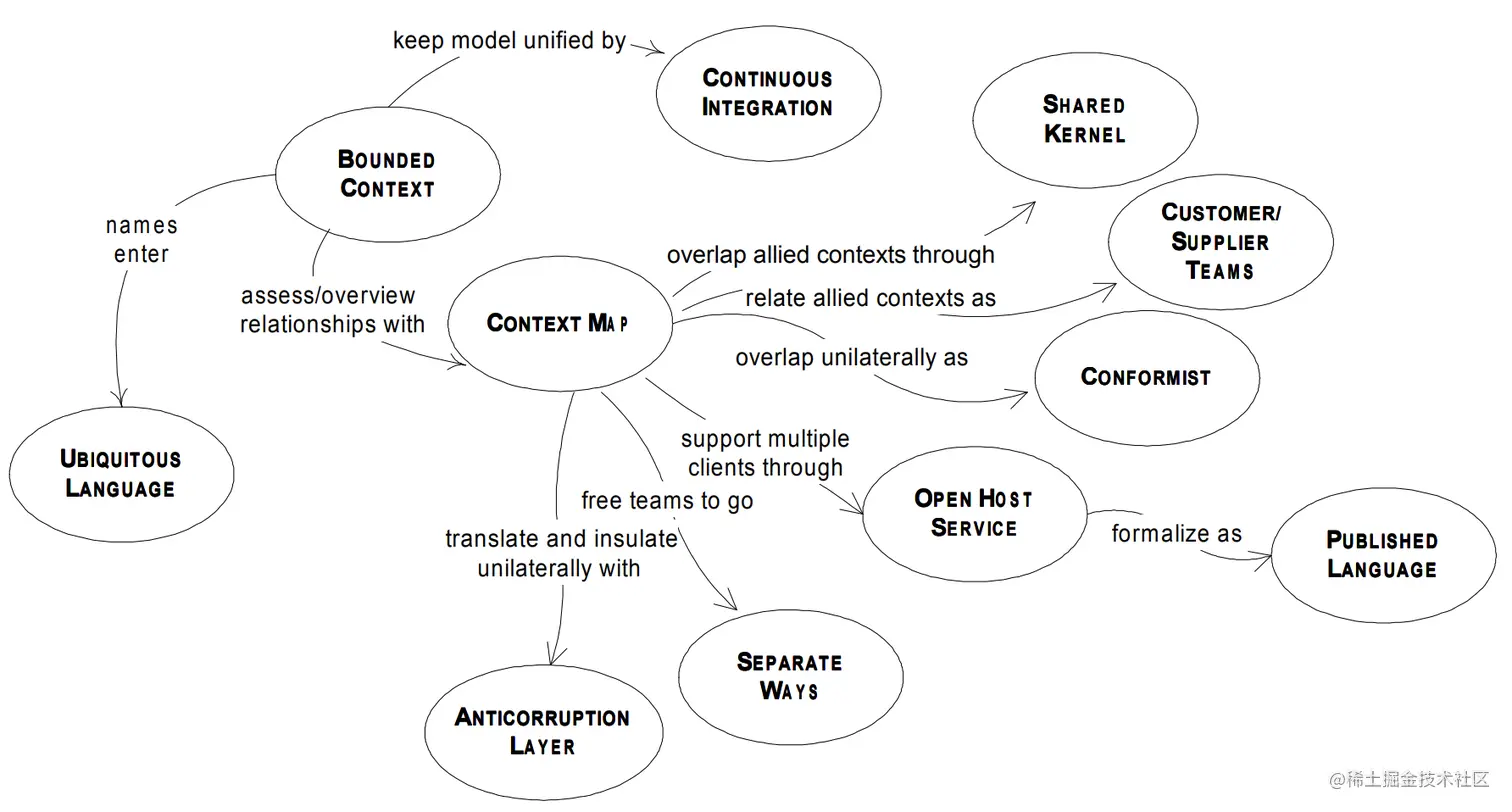 - 上下文映射context map:定义了不同模型上下文件之间的关联,是不同模型集成的基础。