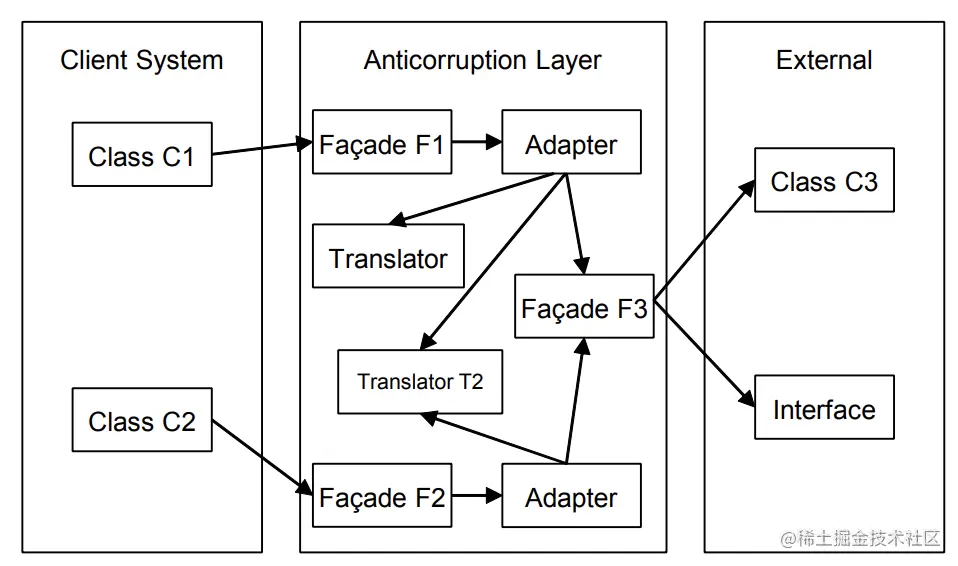- 背景:面对遗留系统(无法改造、无法和当前系统保持设计风格一致性),提供的保护一种转换机制,目的是保证当前系统模型设计的纯洁性、一致性。