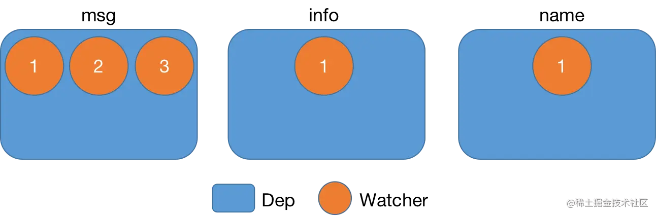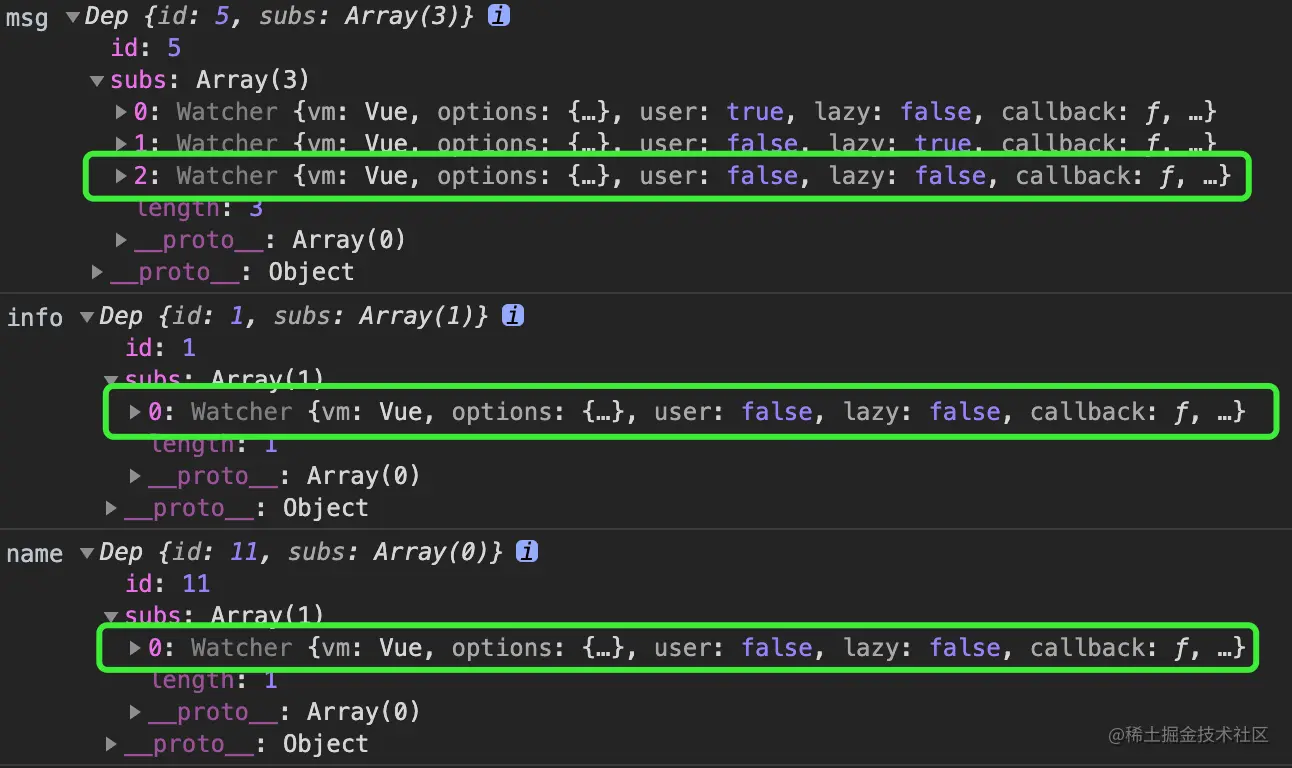 下图就是定义了msg、info、name三个数据,它们都有个渲染Watcher: