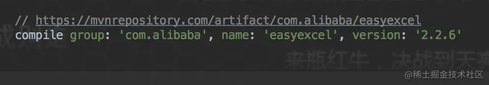 compile group: 'com.alibaba', name: 'easyexcel', version: '2.2.6'