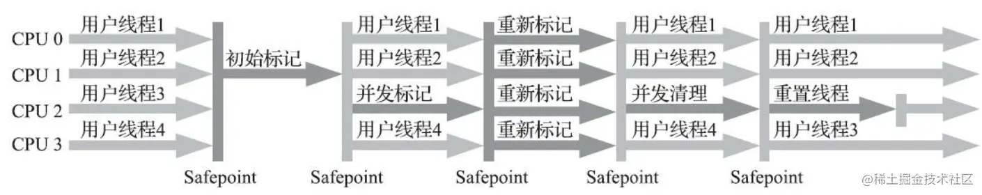 - 重新标记是为了修正并发标记期间,因用户线程继续运作而导致标记产生变动的那一部分对象的标记记录,这个阶段的停顿时间通常会比初始标记阶段稍微长一些,但也远比并发标记阶段的时间短;
