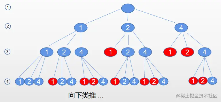 选择列表 在全排列中,相当于抽奖箱中每抽一次,剩下的选择中就要排除掉自己。但这里由于要求不能存在相同的组合(注意理解排列与组合的区别),所以乒乓球在箱子中还得有固定的顺序位置,抽到某个位置后,接下来抽只能继续往前,例如给定[1,2,4]target为3,从1开始,抽取12组合满足条件,当从2开始时,就不能回过头抽1了,不然就重复了。具体遍历方式见下图。这一幕想想是不是似曾相识,我们在选择排序中是不是每次只能与后面的数进行对比!由于数组中的数可以重复选取,那么抽出来的数还得放回原位,下次继续从这个位置出发。