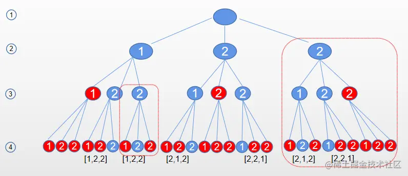 可以看出,如果延续之前的做法,最终的结果中,肯定存在重复的排列。那么如何去重呢?对得到的结果去重可以吗?当然是可以,但是想想这是数组,判断两个数组是否完全一样是不是得把它们每个位置遍历然后对比,显然这种方式不可取,那么有什么更好的办法呢?既然不能对结果去重,那么就想办法对可能造成相同的结果的过程去重。仔细看看上图,就会发现图中红色框框内形成的路径与后面那个重复元素为根节点形成的路径是完全一样的,那么我们在横向遍历的时候跳过这个重复元素即可!