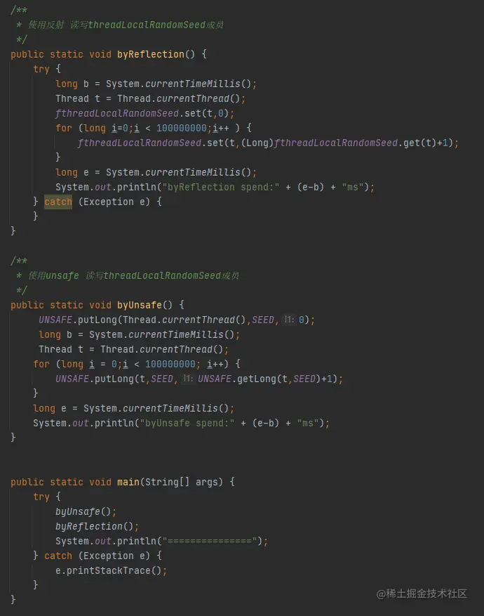 private static Field fthreadLocalRandomSeed; private static final sun.misc.Unsafe UNSAFE; private static final long SEED; static { try { // 反射 获取threadLocalRandomSeed fthreadLocalRandomSeed = Thread.class.getDeclaredField("threadLocalRandomSeed"); fthreadLocalRandomSeed.setAccessible(true); //获取unsafe对象 Field f = Unsafe.class.getDeclaredField("theUnsafe"); f.setAccessible(true); UNSAFE = (Unsafe) f.get(0); //虽然它有静态的getUnsafe()方法,但是如果你尝试调用Unsafe.getUnsafe(),会得到一个SecutiryException。这个类只有被JDK信任的类实例化。// UNSAFE = sun.misc.Unsafe.getUnsafe(); Class<?> tk = Thread.class; //获取threadLocalRandomSeed在thread中的偏移量 SEED = UNSAFE.objectFieldOffset(tk.getDeclaredField("threadLocalRandomSeed")); } catch (Exception e) { throw new Error(e); } } /** * 使用反射 读写threadLocalRandomSeed成员 */ public static void byReflection() { try { long b = System.currentTimeMillis(); Thread t = Thread.currentThread(); fthreadLocalRandomSeed.set(t,0); for (long i=0;i < 100000000;i++ ) { fthreadLocalRandomSeed.set(t,(Long)fthreadLocalRandomSeed.get(t)+1); } long e = System.currentTimeMillis(); System.out.println("byReflection spend:" + (e-b) + "ms"); } catch (Exception e) { } } /** * 使用unsafe 读写threadLocalRandomSeed成员 */ public static void byUnsafe() { UNSAFE.putLong(Thread.currentThread(),SEED,0); long b = System.currentTimeMillis(); Thread t = Thread.currentThread(); for (long i = 0;i < 100000000; i++) { UNSAFE.putLong(t,SEED,UNSAFE.getLong(t,SEED)+1); } long e = System.currentTimeMillis(); System.out.println("byUnsafe spend:" + (e-b) + "ms"); } public static void main(String[] args) { try { byUnsafe(); byReflection(); System.out.println("==============="); } catch (Exception e) { e.printStackTrace(); } }
