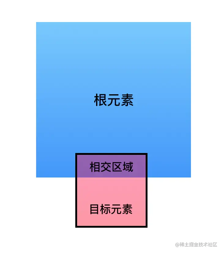 - intersectionRect:目标元素与视口(或根元素)的交叉区域的信息,图中蓝色方块和粉红色方块相交的区域。