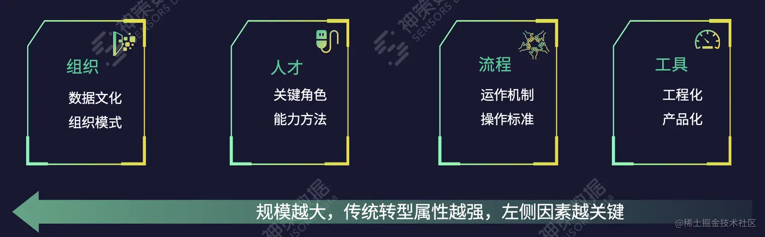 很多时候,组织的模式跟企业内部的数据文化是有重要关联的。一家企业着手推动数据全面应用有两个契机:一是公司整体组织架构开始重视数据;另一种是团队内空降了一个厉害的决策者,由他负责调动资源和人力等。从我们过往的服务客户经验中来看,组织和人才是最顶层、最重要的两个因素。