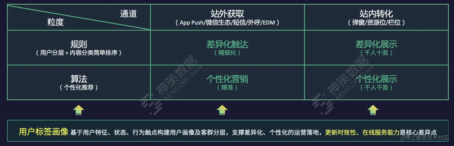 精细化运营、精准推荐、千人千面等基本上可以通过粒度和通道两个维度来做详细拆解,其规则和算法是聚焦在各个不同的应用场景中去实现的。如下图:
