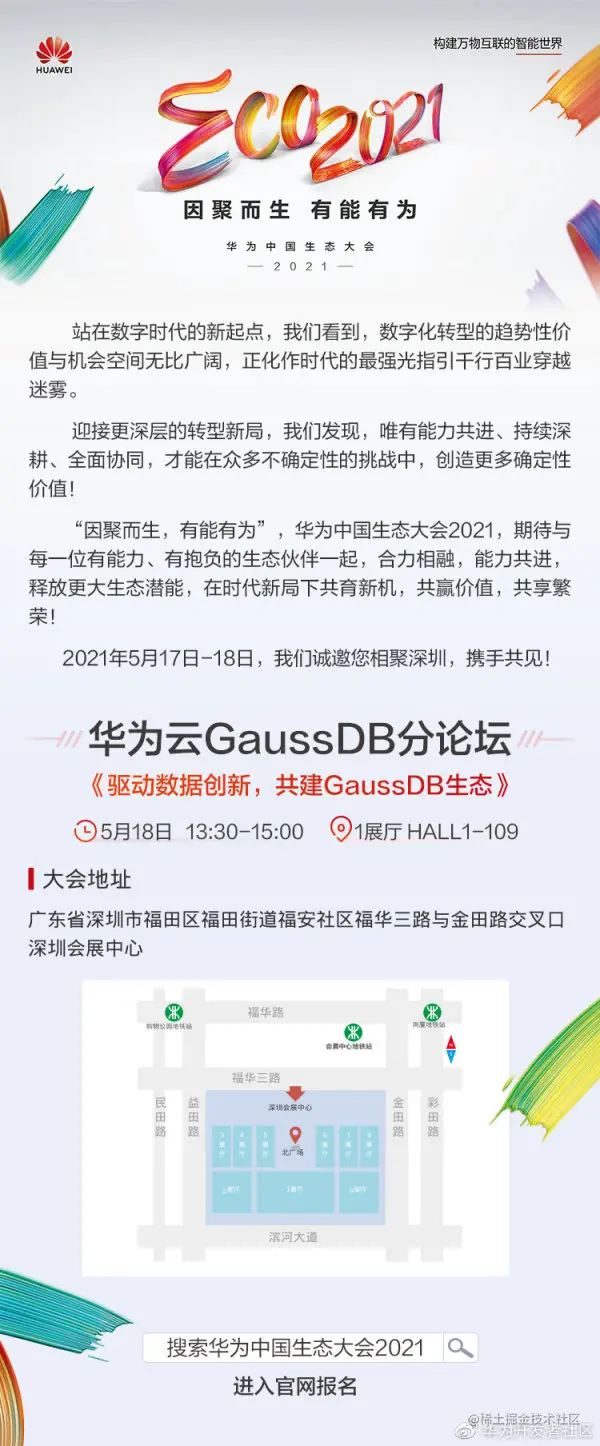 5 月 17-18 日,华为中国生态大会 2021 即将在深圳会展中心举行,华为云数据库 CTO 庄乾锋将在现场详细分享和解读 GaussDB 的产品力和生态计划,并联合 5 家合作伙伴重磅发布 5 大解决方案,更多精彩内容,敬请前往大会现场聆听!华为云 GaussDB 期待与每一位有能力、有抱负的生态伙伴一起,合力相融,能力共进,释放更大生态潜能,在时代新局下共育新机,共赢价值,共享繁荣!