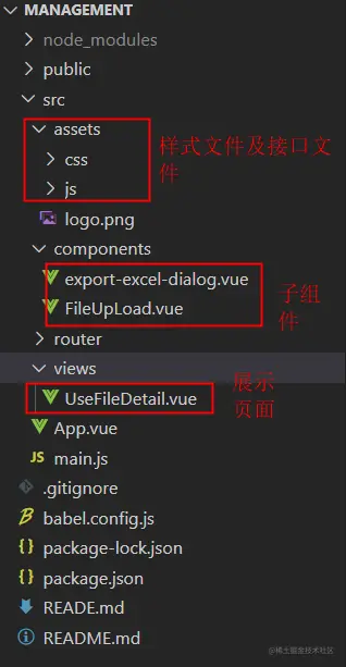 上图所示为项目结构,FileUpLoad为导入导出组件,export-excel-dialog为导出后显示的选项弹框,UseFileDetail为实际项目中包含导入导出组件的父级页面,App.vue为路由出口文件。