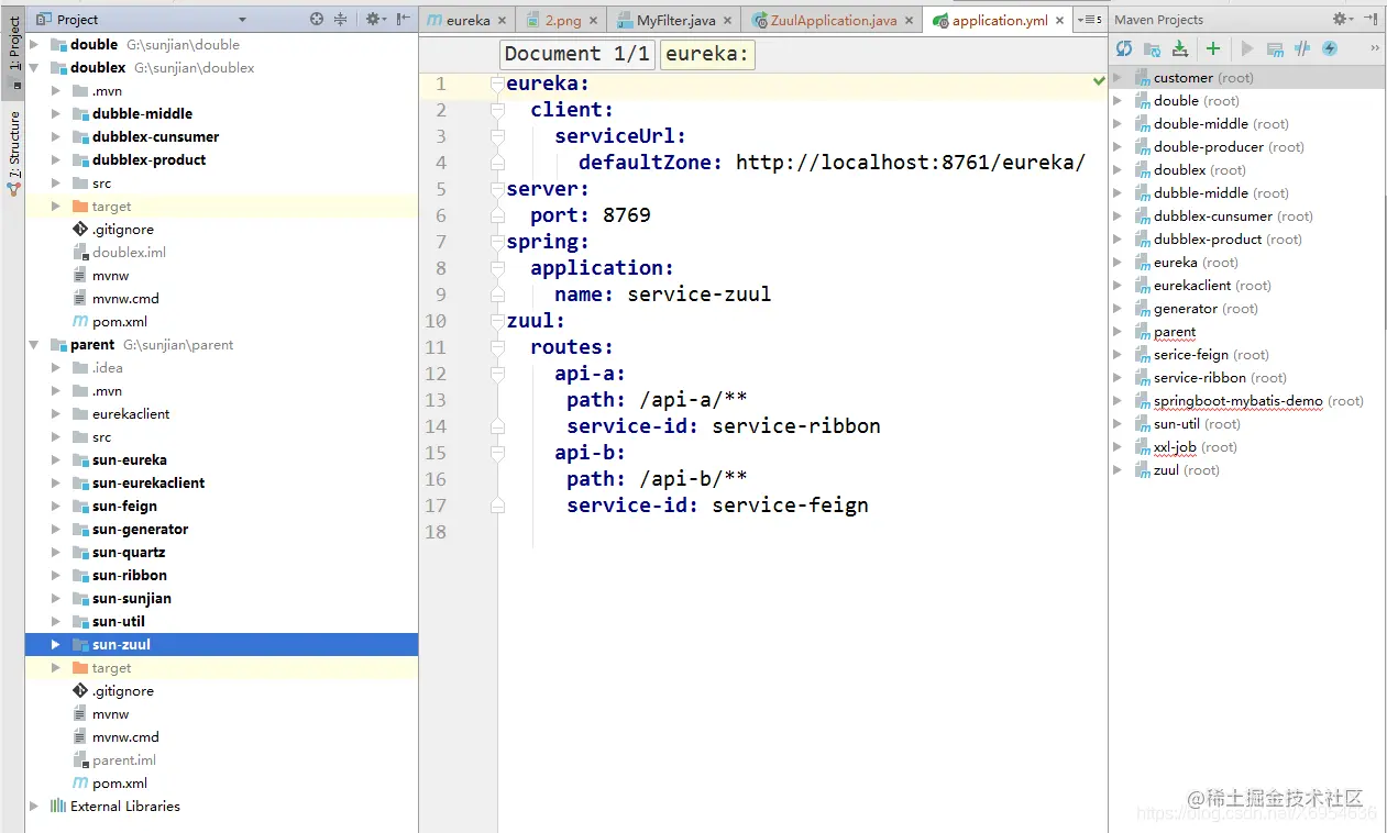 以上是我的springcloud项目,eureka是注册中心,zuul是注册网关,ribbon和feign都是cloud的rpc远程调用。