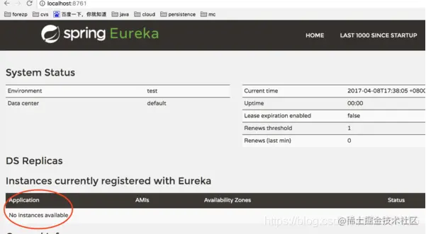 需要指明spring.application.name,这个很重要,这在以后的服务与服务之间相互调用一般都是根据这个name 。 启动工程,打开http://localhost:8761 ,即eureka server 的网址: