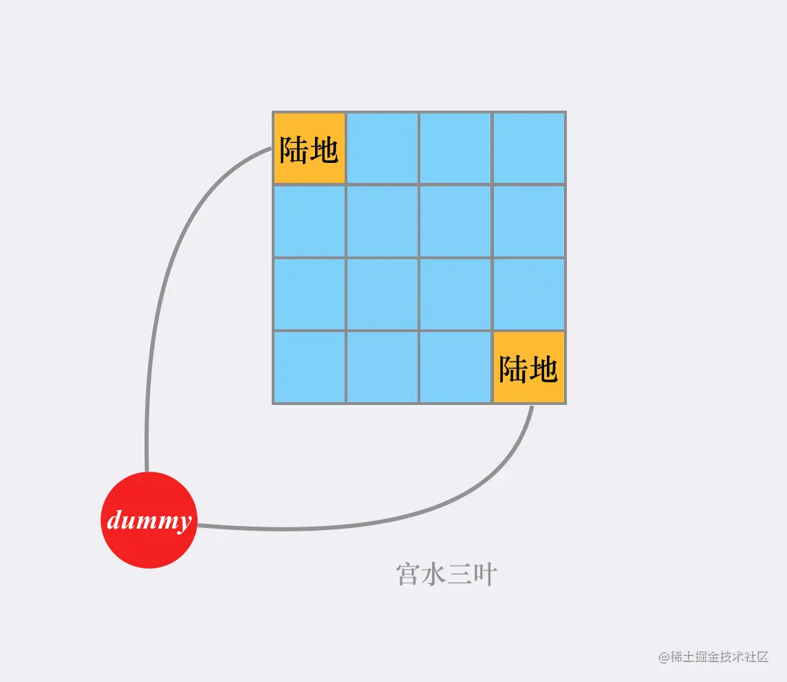 我们可以想象存在一个「虚拟源点」,其与所有「真实源点」(陆地)存在等权的边,那么任意「海洋」区域与「最近的陆地」区域的最短路等价于与「虚拟源点」的最短路: