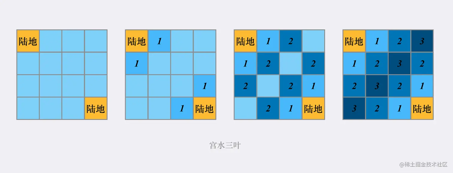 我们可以将「源点/起点」和「汇点/终点」进行反转:从每个「陆地」区域出发,多个「陆地」区域每次同时向往扩散一圈,每个「海洋」区域被首次覆盖时所对应的圈数,就是「海洋」区域距离最近的「陆地」区域的距离。