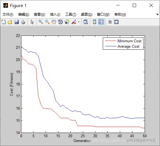 num2str(MinCost(end)), ' and ', num2str(AvgCost(end))]);