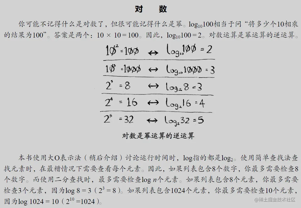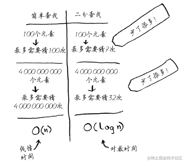 如果列表包含40亿个数字,最多需猜32次。二分查找的运行时间为对数时间(或log时间)