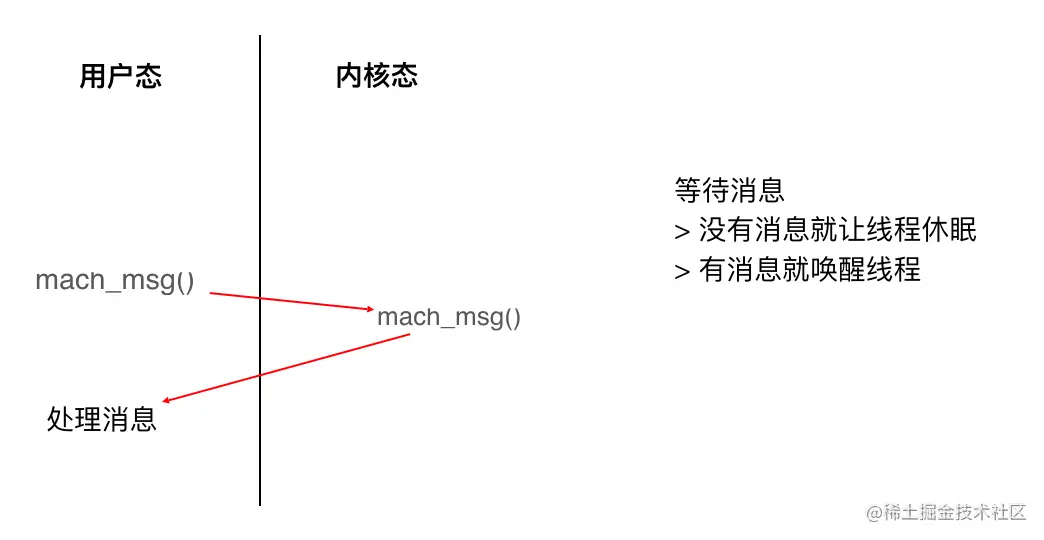 // 8. RunLoop开始休眠:等待消息唤醒,调用 mach_msg 等待接收 mach_port 的消息。