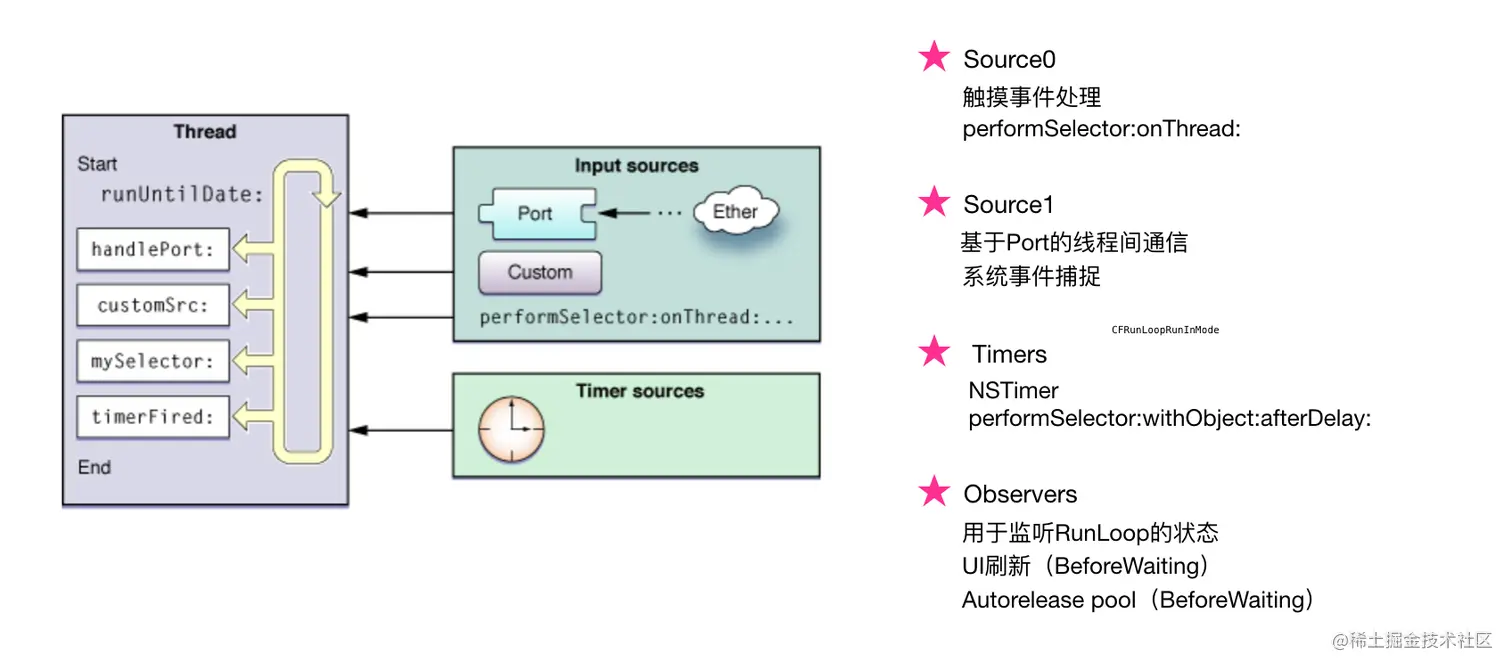 CFSocketRef,在应用层基本用不到。 - Custom Input Sources,非基于Port事件,用户手动创建的 Source,则必须从其他线程手动发送信号。