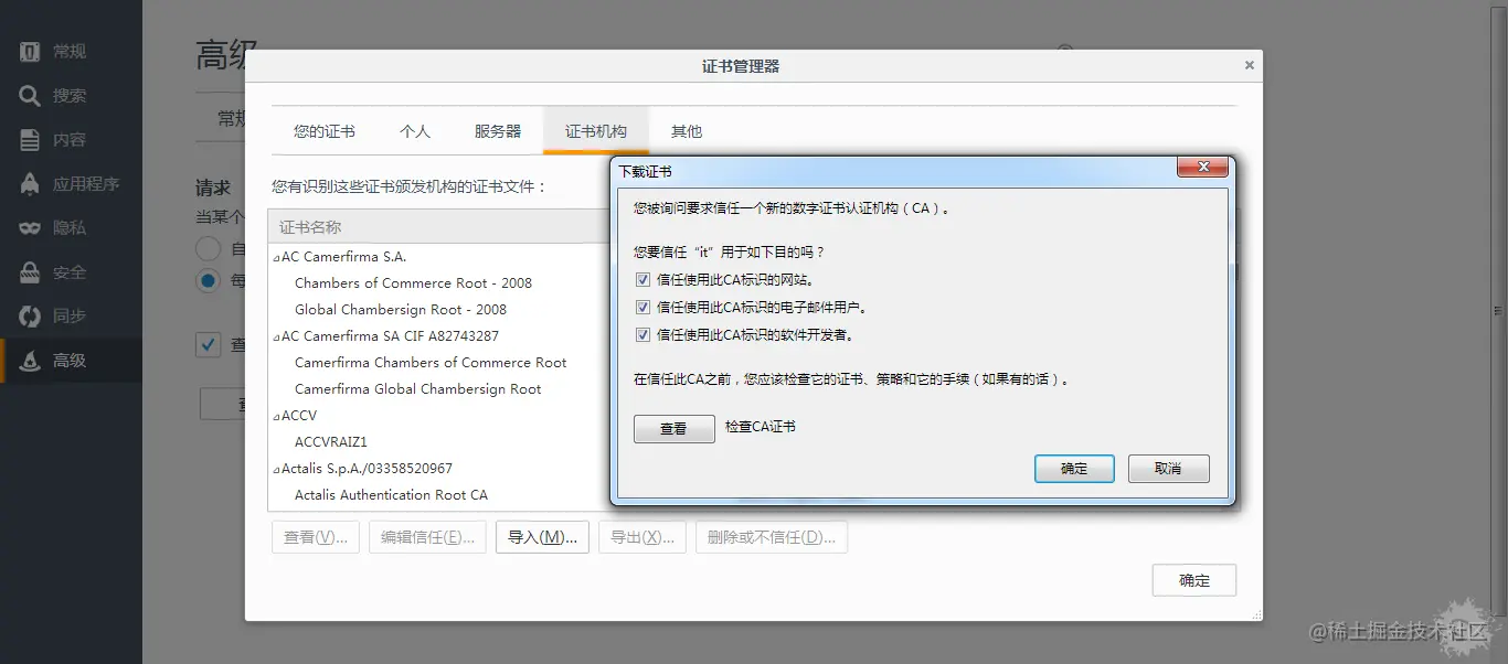 进入Firefox的设置里面,选择高级,然后选择证书机构,导入刚才下载的证书