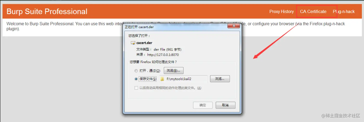 点击CA certificate下载burpsuite的证书,保存证书文件