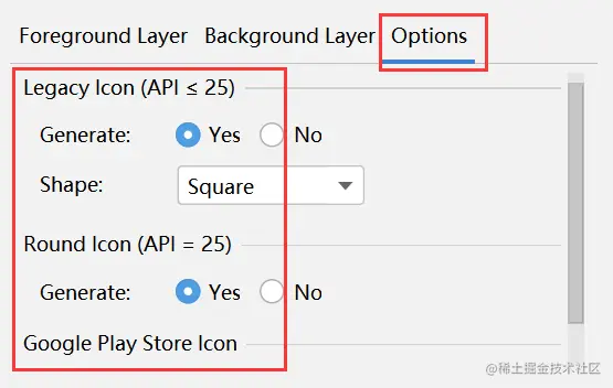 - 在Options选项卡中,查看默认设置并确认你要生成 Legacy、Round 和 Google Play Store 图标。